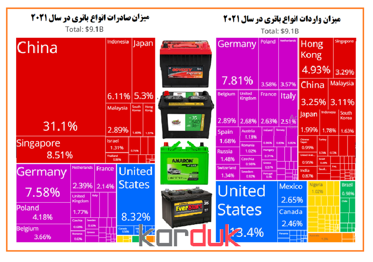 طی سال‌های 2020 و 2021، صادرات انواع باتری  با 8.26 درصد رشد  از 8.4 میلیارد دلار به 9.1 میلیارد دلار افزایش یافت. تجارت باتری 0.043 درصد از کل تجارت جهانی را تشکیل می دهد. بزرگترین  کشورهای صادرکنندگان باتری جهان به ترتیب چین  (2.83 میلیارد دلار)، سنگاپور (775 میلیون دلار)، ایالات متحده (757 میلیون دلار)، آلمان (690 میلیون دلار) و اندونزی (556 میلیون دلار) بودند و بزرگترین  واردکنندگان در سال 2021 نیز کشورهای  آمریکا (1.22 میلیارد دلار)، آلمان (711 میلیون دلار)، هنگ کنگ (449 میلیون دلار)، لهستان (326 میلیون دلار)، و هلند (325 میلیون دلار) هستند.